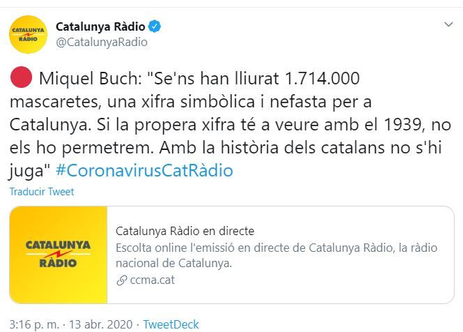El consejero de interior, Miquel Buch, montó en cólera contra el Gobierno de España por haber entregado a la Generalitat 1.714.000 mascarillas para repartir entre la población.