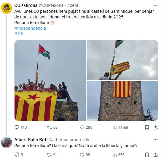 La CUP de Gerona ha decidido, para calentar la manifestación separatista del 11 de septiembre, ir al Castillo de Sant Miquel, que está entre Gerona y Celrà, y colgar una gran estelada – el símbolo separatista catalán – del torreón, junto a una bandera palestina. Y han difundido esta ‘gesta’ en redes sociales con el lema «Por una tierra libre».