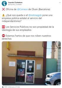 La entidad constitucionalista Impulso Ciudadano denunció a través de sus redes sociales que había una oficina de Correos, concretamente la del municipio barcelonés de Olvan, en la que se podían ver en su puerta dos esteladas.