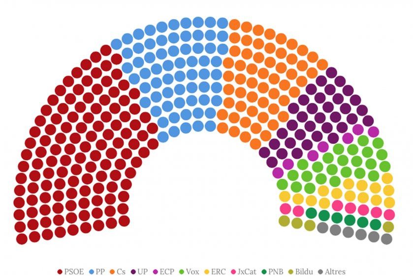 Con esta situación y haciendo una media nos dejaría al PSOE con menos de 120 diputados; al PP de Pablo Casado con 100; a VOX, con 46; a Cs, con 14, y a Unidas Podemos con 33. El centro derecha sumaría más diputados, aunque quedaría todavía lejos de la mayoría absoluta.
