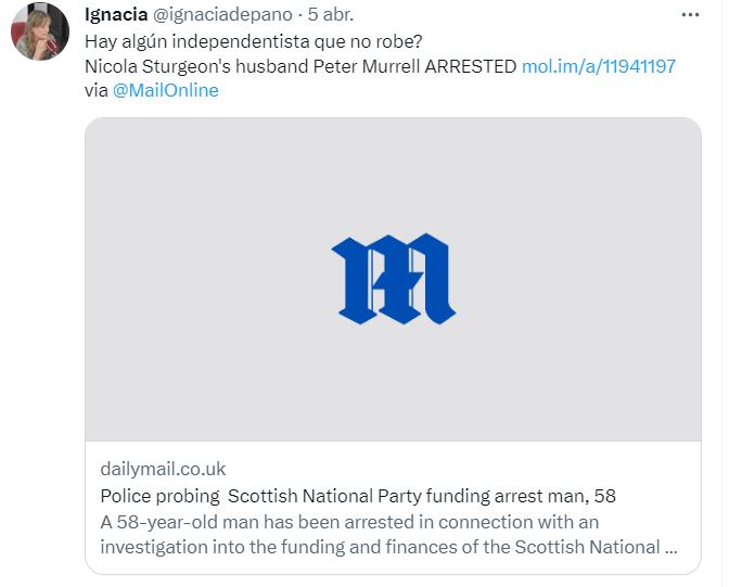 Lo hizo al comentar la detención por la policía del político independentista escocés Peter Murrell, dirigente del Scottish National Party (SNP) y marido de la ex primera escocesa Nicola Sturgeon. El motivo sería unas presuntas irregularidades financieras en esta formación política, que en la actualidad gobierna las instituciones regionales escocesas.