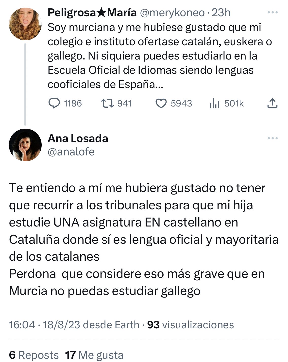 «Te entiendo a mí me hubiera gustado no tener que recurrir a los tribunales para que mi hija estudie UNA asignatura EN castellano en Cataluña donde sí es lengua oficial y mayoritaria de los catalanes. Perdona que considere eso más grave que en Murcia no puedas estudiar gallego«, le espetó Losada a una tuitera. El zasca todavía resuena en las redes sociales.