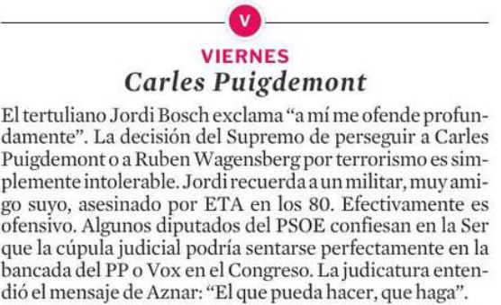 Lo ha hecho en la sección que publica en el suplemento ‘Vivir en Barcelona’, un dietario en el que repasa los contenidos de su programa (‘El món a RAC1’) de la pasada semana. Este espacio radiofónico es el más escuchado, con diferencia, en Cataluña, con más de 700.000 oyentes, a mucha diferencia del segundo programa (‘El matí de Catalunya Ràdio’), que supera de poco los 400.000.