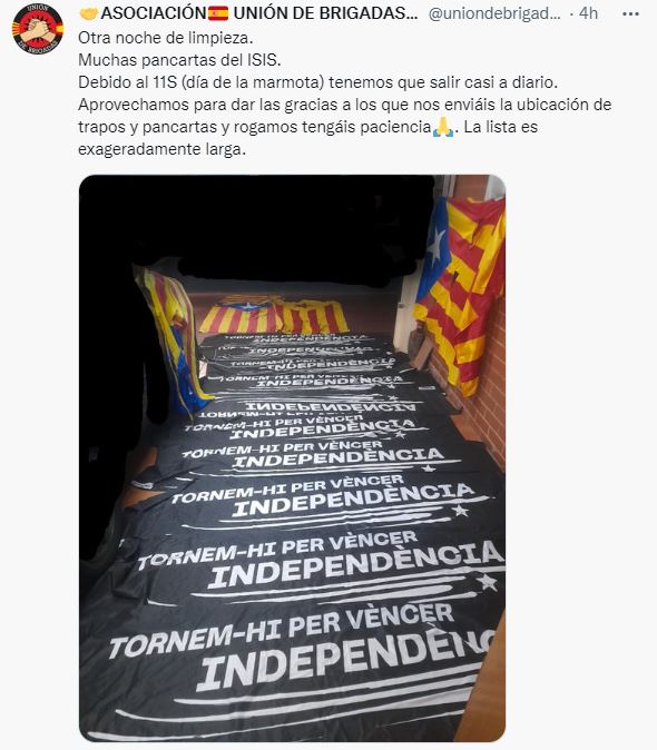 Unión de Brigadas, uno de los colectivos más activos de la Resistencia al separatismo, toma nota de estos avisos y poco a poco va retirando estos símbolos excluyentes. Tras el 11 de septiembre ha aumentado su trabajo, al haber llenado los secesionistas de esteladas y similares el espacio público.
