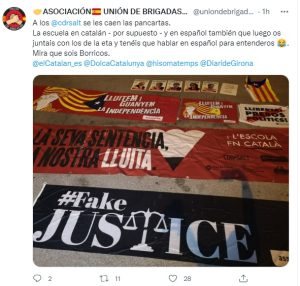 Uno de los grupos más activos es Unión de Brigadas, que esta pasada noche han estado por tierras gerundenses, y más concretamente en Salt, donde han retirado varias pancartas y carteles separatistas de la vía pública.