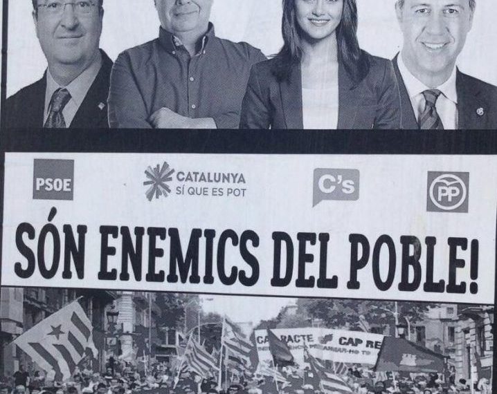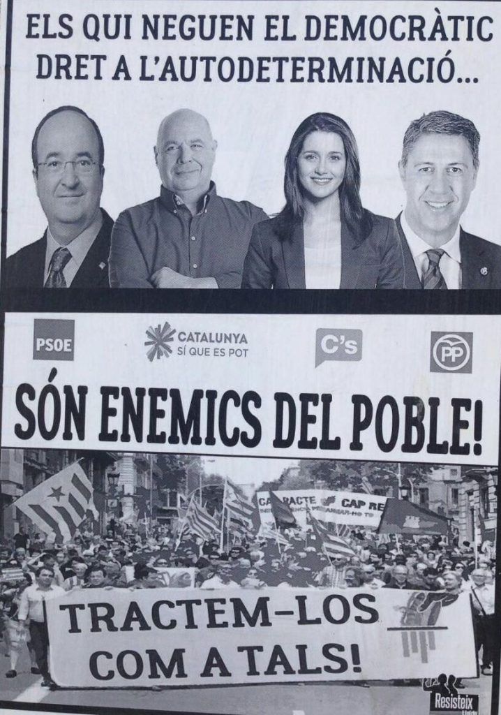 Un grupo radical radicado en Lleida, «Resisteix Lleida», ha colgado en buena parte de la ciudad unos pasquines en los que se señala a los líderes de cuatro formaciones parlamentarias como «enemigos del pueblo» por «negar el democrático derecho a la autodeterminación», y pide que «se los trate como a tales». Los políticos señalados son Inés Arrimadas (Ciudadanos), Miquel Iceta (PSC), Xavier García Albiol (PP) y Lluís Rabell (Catalunya sí que es pot).