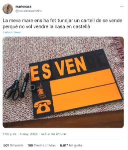 En un mensaje esta tuitera ha difundido que «mi madre nos ha hecho tunear un cartel de «se vende» porque no quiere vender la casa en castellano», y se ve como con tijeras, pegamento y rotulador han traducido al catalán el típico rotulo que se encuentra en las tiendas de «todo a un euro».