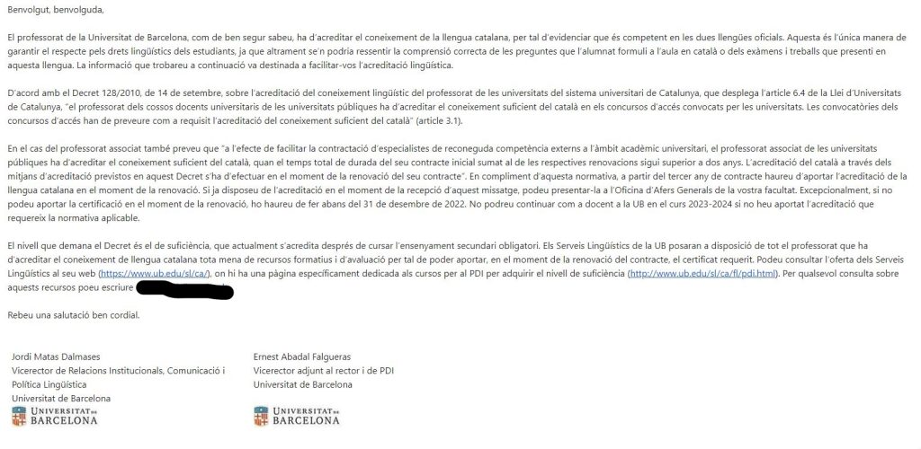 «El profesorado de la Universidad de Barcelona, como bien sabréis, ha de acreditar el conocimiento de la lengua catalana, para evidencia que es competente en las dos lenguas oficiales. Esta es la única manera de garantizar el respeto por los derechos lingüísticos de los estudiantes, ya que de otra manera se podría resentir la comprensión correcta de las preguntas que el alumnado formule en el aula en catalán o de los exámenes y trabajos que presente en esta lengua». Se obliga a profesionales de prestigio a que si quieren dar clases en la UB tengan que acreditar en tres años su dominio del catalán.