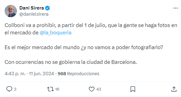 “Collboni va a prohibir, a partir del 1 de julio, que la gente se haga fotos en el mercado de @la_boqueria Es el mejor mercado del mundo ¿y no vamos a poder fotografiarlo? Con ocurrencias no se gobierna la ciudad de Barcelona”, ha afirmado Sirera.