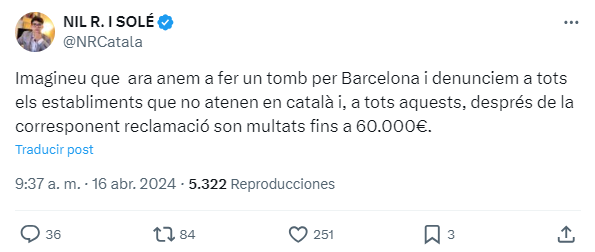 “Imaginaros que ahora vamos a dar una vuelta por Barcelona y denunciamos a todos los establecimientos que no atienden en catalán y, a todos estos, después de la correspondiente reclamación son multados hasta 60.000€”, afirma un joven separatista en su red social X. Desde bien jóvenes ya dispuestos a ejercer de chivatos y perjudicar a comercios que las pasan canutas para llegar a fin de mes. Flaco favor le hace al catalán.