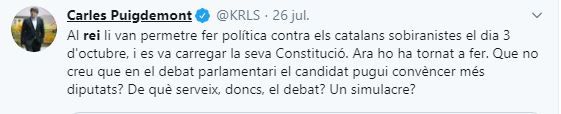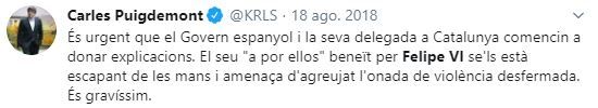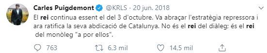 Esta expresión ya la utilizó el 20 de junio de 2018 en otro mensaje en la red social Twitter. Y también la vinculó a Felipe VI en otro tuit del 18 de agosto del mismo año.