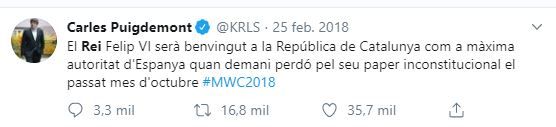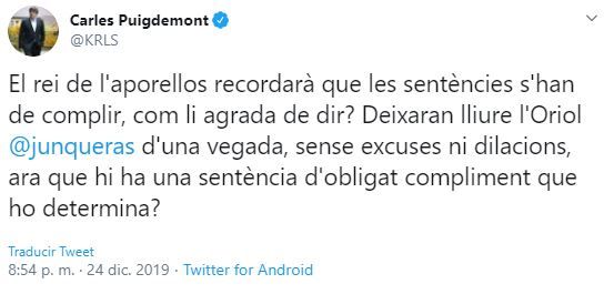 El mensaje de Puigdemont era el siguiente: «¿El rey del aporellos recordará que las sentencias se han de cumplir como le gusta decir?».