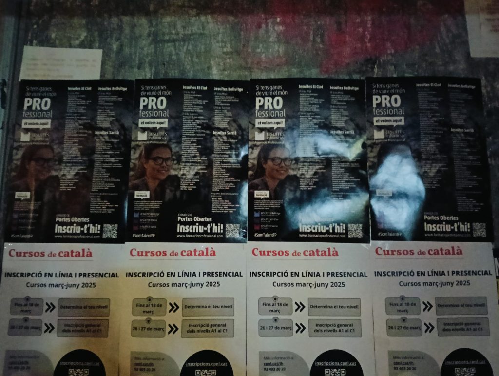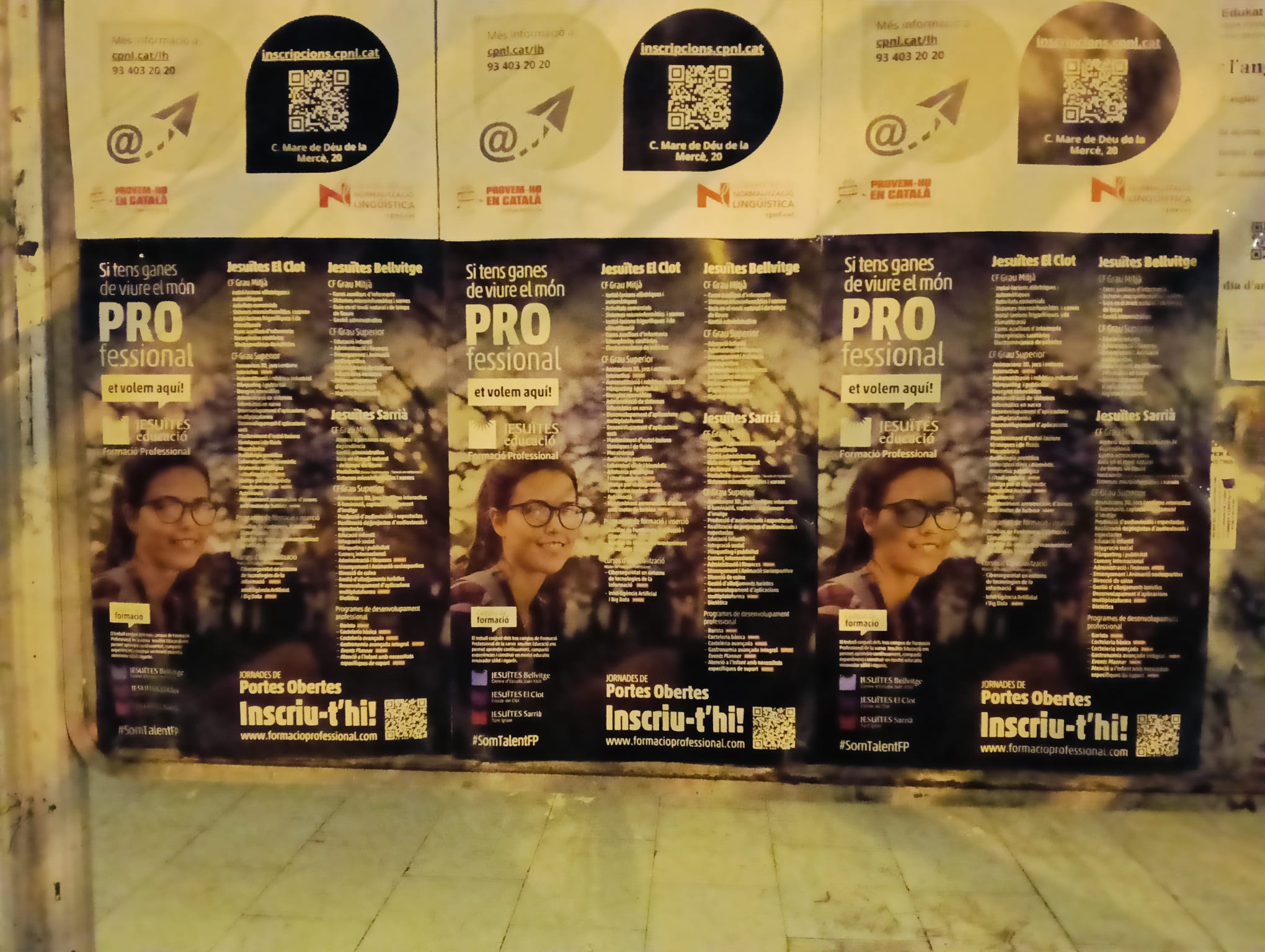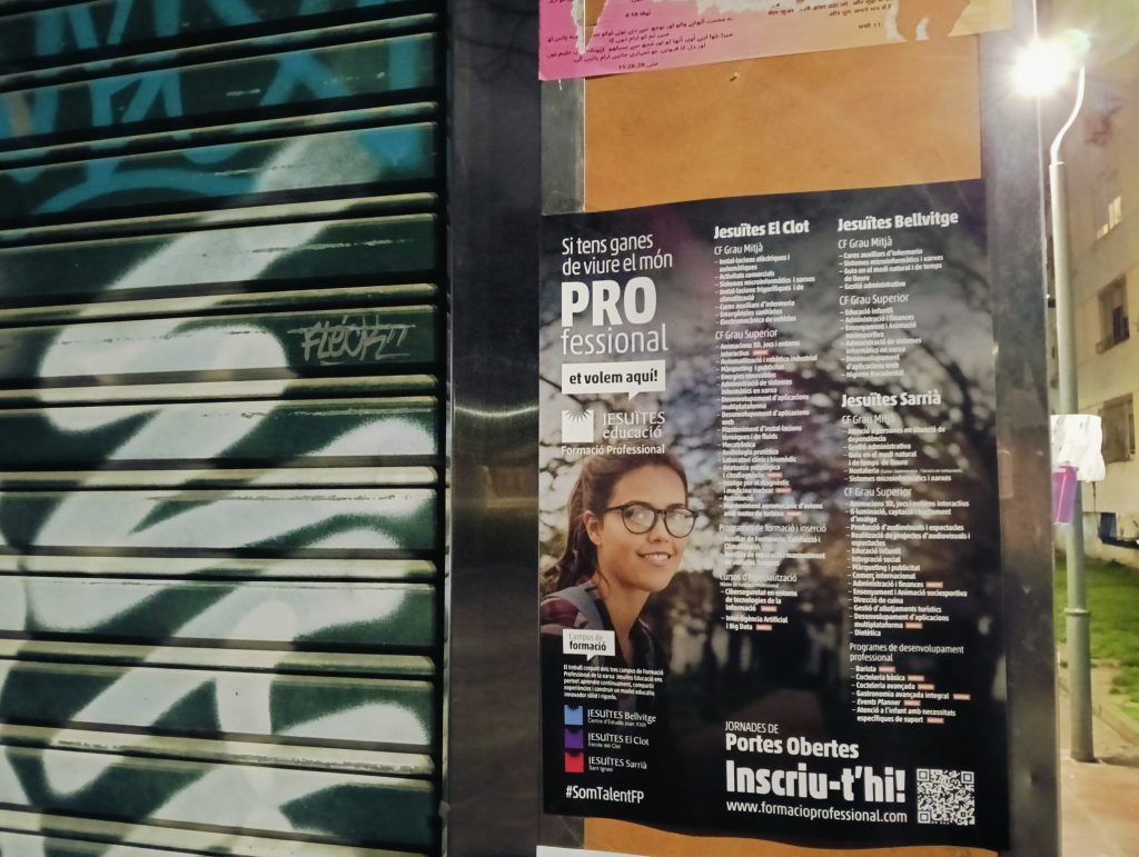 Los jesuitas hace unos días llenaron Bellvitge, en L’Hospitalet de Llobregat, de carteles promoviendo sus jornadas de puertas abiertas para informar de sus programas de formación profesional en los tres centros escolares que tienen en Barcelona y alrededores con esta oferta educativa.