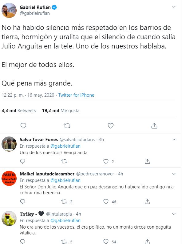 El que no podía faltar para dar la nota ha sido Gabriel Rufián, que como es costumbre ya ha vuelto a ‘patinar’ en las redes sociales cuando ha querido recordar a Julio Anguita como «uno de los nuestros«.