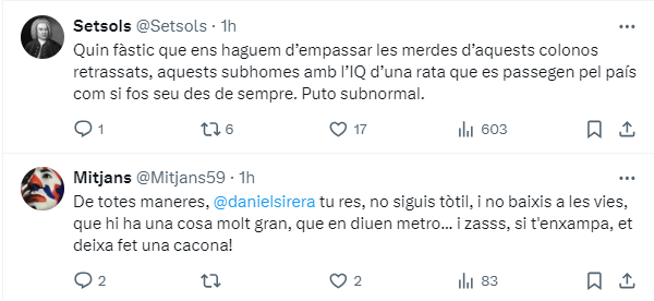 Entre algunos de los comentarios que ha recibido Daniel Sirera en las últimas horas hay alguno que incluso le desea la muerte, por el simple hecho de exigir que el castellano esté presente en la rotulación del Metro en Barcelona, así está el patio.