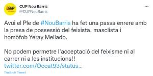 Además, desde el perfil oficial de los antisistema de la CUP en Nou Barris, se han vertido todo tipo de insultos hacía el nuevo conseller del distrito «machista«, «fascista» y «homófobo«. Conviene recordar que Cataluña se encuentra en manos de este partido. Nada más que añadir.