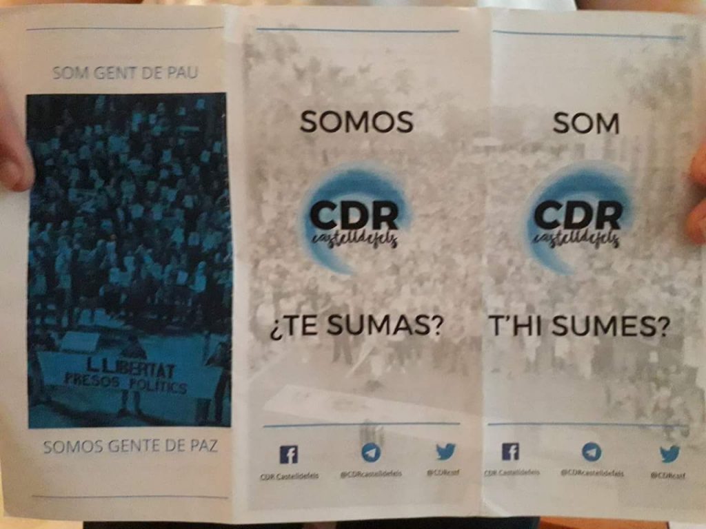 CDRs como el de la localidad barcelonesa de Castelldefels están buzoneando folletos para captar nuevos adeptos en los que aseguran que «son gente de paz» e incitan a los ciudadanos a «sumarse» a estos autodenominados «comités».