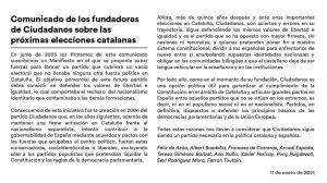 Cabe recordar que la gran mayoría de los fundadores de Ciudadanos se alejaron del partido en la etapa final de Albert Rivera. Félix de Azúa, Albert Boadella, Francesc de Carreras, Arcadi Espada, Teresa Giménez Barbat, Ana Nuño, Xavier Pericay, Ponç Puigdevall, Sevi Rodríguez Mora y Ferran Toutain han suscrito dicho manifiesto.
