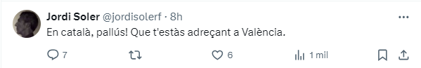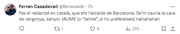 El alcalde de Barcelona, Jaume Collboni, ha mandado a través de sus redes sociales un mensaje de apoyo a la alcaldesa de Valencia, María José Catalá, y lo ha hecho en castellano. Los radicales no han tardado en echarle en cara que no lo hubiera hecho en catalán.