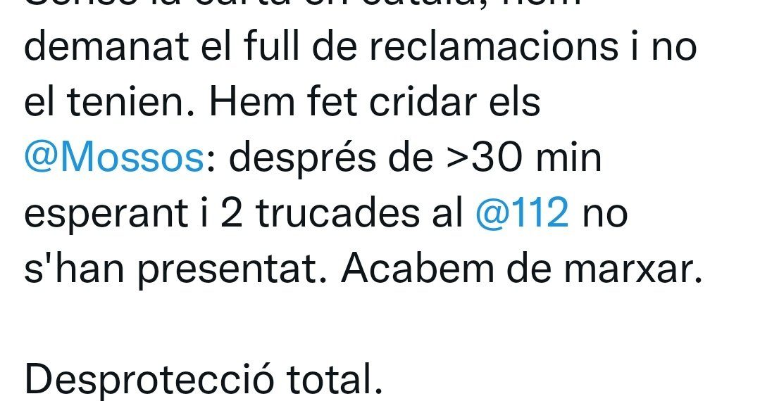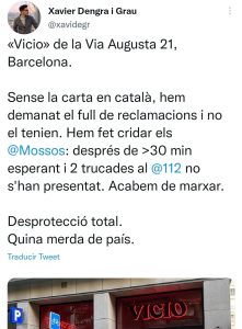 «Vicio de la Vía Augusta 21, Barcelona. Sin la carta en catalán, hemos pedido la hoja de reclamaciones y no la tenían. Hemos llamado a los @Mossos: después de >30 min esperando y 2 llamadas al @112 no se han presentado. Acabamos de irnos. Desprotección total. Qué mierda de país«, ha afirmado este indignado independentista.