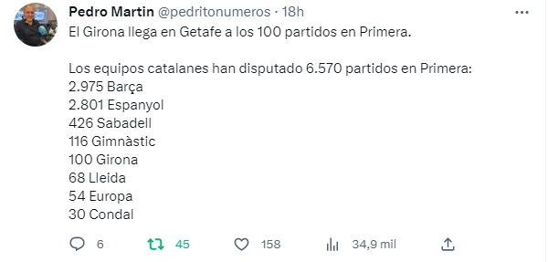 Los datos aportados por el periodista de COPE, Pedro Martín, nos aportan unos datos demoledores para los que de forma artificial quieren convertir en segundo equipo de Cataluña a un club que hace ‘dos días’ que come en la mesa de los grandes. Los equipos catalanes han disputado un total de 6.570 partidos en Primera División.