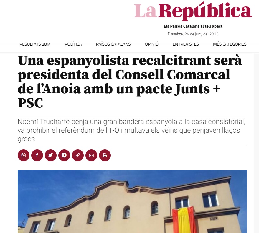 Ahora, presidirá durante dos años el Consell Comarcal de l’Anoia, donde se repartirá el poder con Junts, que gobernará los destinos del Consell los dos siguientes mandatos. Este hecho, ha irritado sobremanera a los separatistas que la han tildado de «españolista recalcitrante» en algunos titulares de prensa.