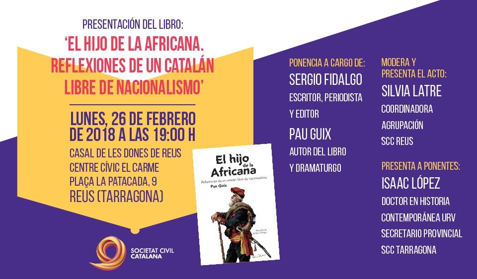 El lunes, a las 19:00, en el Casal de les Dones de Reus (Plaça La Patacada, 9), Societat Civil Catalana organiza un coloquio sobre el libro ‘El hijo de la africana. Reflexiones de un catalán libre de nacionalismo’. Intervendrán Isaac López, secretario provincial SCC Tarragona; Silvia Latre, coordinadora agrupación SCC Reus; Sergio Fidalgo, periodista y Pau Guix, autor de la obra.