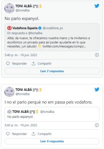 El servicio de atención al cliente de la empresa de telefonía se ha puesto en contacto con él a través de Twitter y la respuesta de Toni Albà ha sacado a relucir su sectarismo «No hablo español«, y en otro mensaje ha remarcado que «Y no lo hablo porque no me sale de los vodafons«. Ridículo, con mayúsculas.