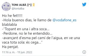 Albà, ha llevado a cabo un mayúsculo ridículo, que además ha transmitido en su cuenta de Twitter, con una compañía telefónica por el uso del castellano. Ante una llamada de Vodafone, el ‘humorista’ ha respondido con un poema de ‘La vaca cega’ escrito en catalán por Joan Maragall en el año 1893.