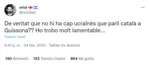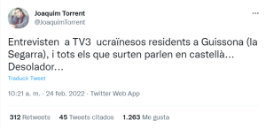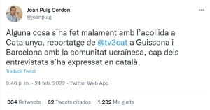 Entre ellos se encuentra Joan Puig, editor del digital separatista ‘La República’ y quien fuera en su momento diputado de Esquerra en el Congreso, entre otros cargos públicos. Este señor hace un par de días afirmó en sus redes sociales que «algo se ha hecho mal con la acogida en Cataluña, reportaje de @tv3cat en Guissona y Barcelona con la comunidad ucraniana, ninguno de los entrevistados se ha expresado en catalán«. Juzguen ustedes mismos.