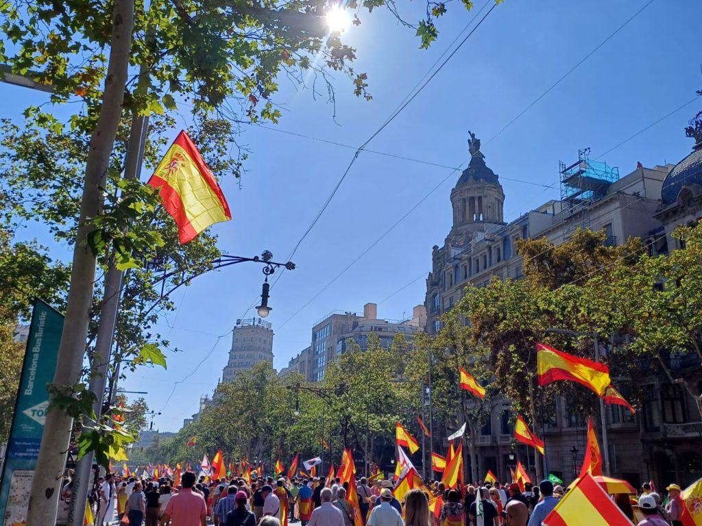 Miles de personas han participado este domingo en los actos que la entidad Espanya i Catalans ha convocado con motivo de la Fiesta Nacional y el Día de la Hispanidad. El momento álgido de la jornada consistió en una manifestación que transcurrió en un ambiente festivo y familiar por el Paseo de Gracia y que finalizó en Plaza Cataluña, dónde se celebró un acto cívico.