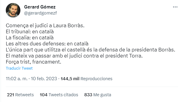 «Empieza el juicio a Laura Borràs. El tribunal: en catalán. La fiscalía: en catalán. Las otras dos defensas: en catalán. La única parte que utiliza el castellano es la defensa de la presidenta Borràs. Lo mismo ocurrió con el juicio contra el presidente Torra. Muy triste, francamente«, afirmaba el periodista Gerard Gómez — que también es un destacado militante de ERC y ha sido diputado en el Parlament y en el Congreso — a través de su cuenta de Twitter, en un mensaje que se ha hecho viral. Se da la circunstancia que Gonzalo Boye es el abogado de Borràs.