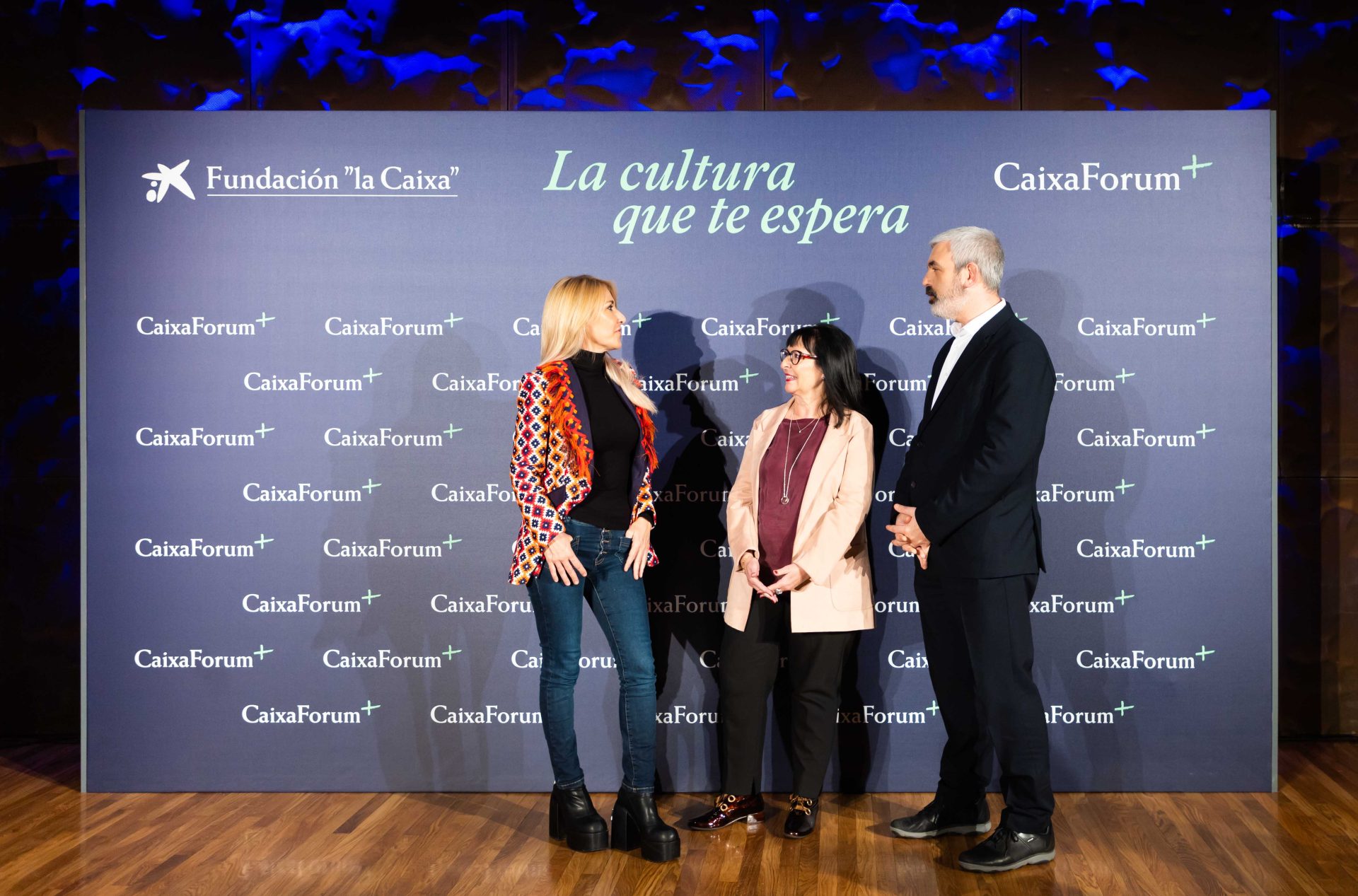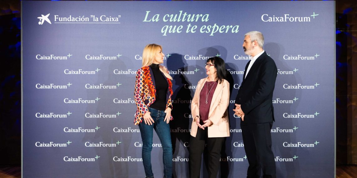 (Fotografía: la actriz y presentadora Cayetana Guillén Cuervo; la directora general adjunta de la Fundación ”la Caixa”, Elisa Durán, y el director corporativo del Área de Cultura y Ciencia de la Fundación ”la Caixa”, Ignasi Miró, conversando en la presentación de CaixaForum+)
