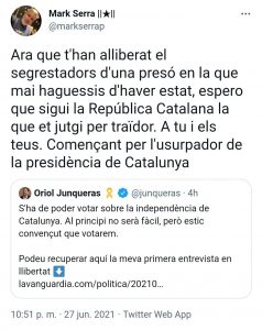 «Ahora que te han liberado los secuestradores de una prisión en la que nunca hubieras tenido que estar, espero que sea la República Catalana la que te juzgue por traidor. A ti y los tuyos. Empezando por el usurpador de la presidencia de Cataluña«, ha afirmado en sus redes sociales Mark Serra, del círculo íntimo del fugitivo Puigdemont.