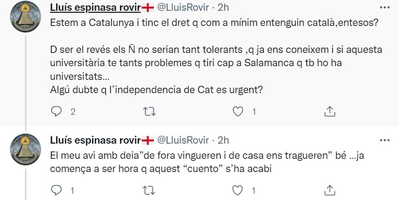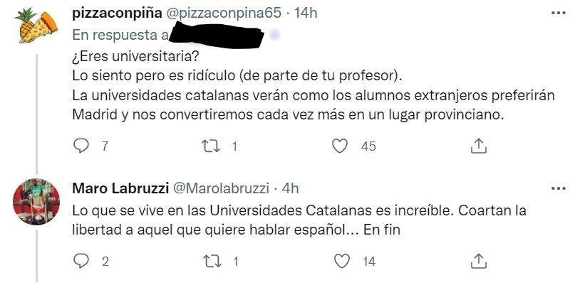 Esta valiente denuncia ha provocado un buen número de mensajes de solidaridad con la estudiante y, cómo es habitual por parte del separatismo más radical, un buen número de ataques personales e insultos, para intentar descalificar a quién no hace más que reclamar sus derechos lingüísticos: ser atendido en español en su país, España.