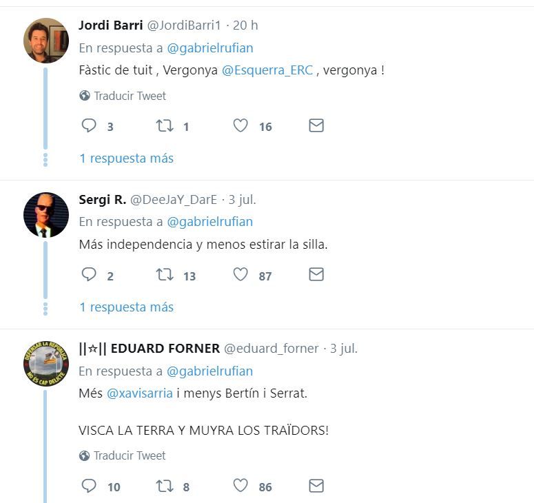 A los secesionistas radicales no les ha gustado nada ese tuit de Rufián, y le ha caído una importante lluvia de insultos de sus propios «amigos», que lo han llamado «traidor» y «canalla» entre otro tipo de lindezas.