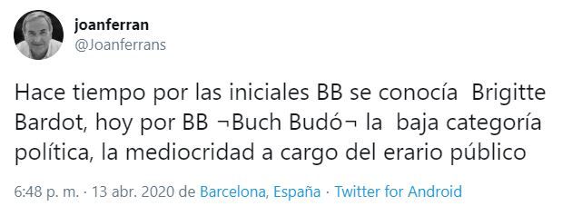 El ex diputado socialista en el Parlament Joan Ferran ha tirado de ironía: «Hace tiempo por las iniciales BB se conocía Brigitte Bardot, hoy por BB -Buch Budó- la baja categoría política, la mediocridad a cargo del erario público».