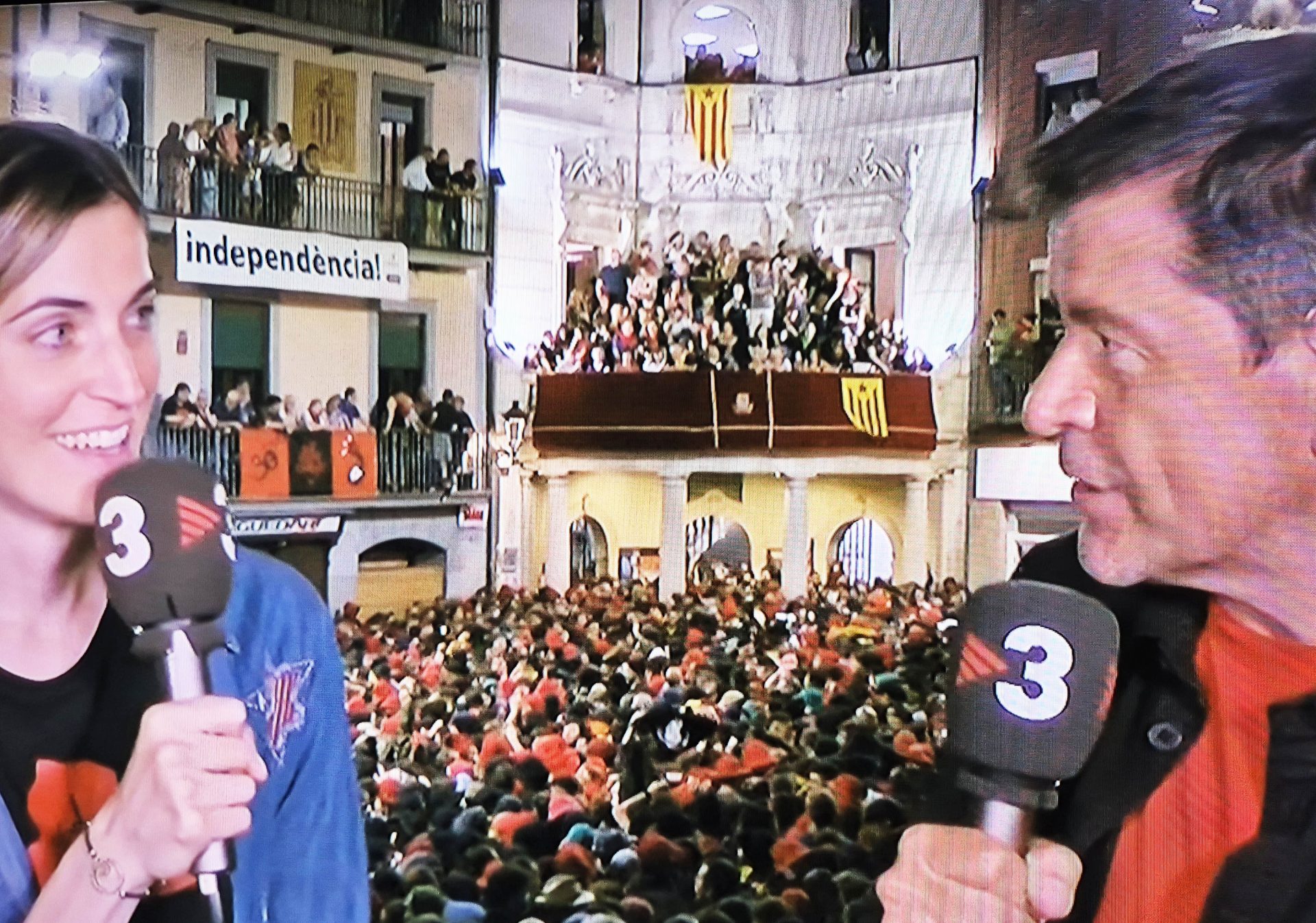 Mientras era interpretado el himno de “Els Segadors” desde la puerta de la iglesia de Santa Eulàlia se fue desplegado una gigantesca una “estelada” con el lema: «República Catalana» y al mismo tiempo se desplegó desde un balcón un enorme retrato del rey Felipe VI boca abajo.