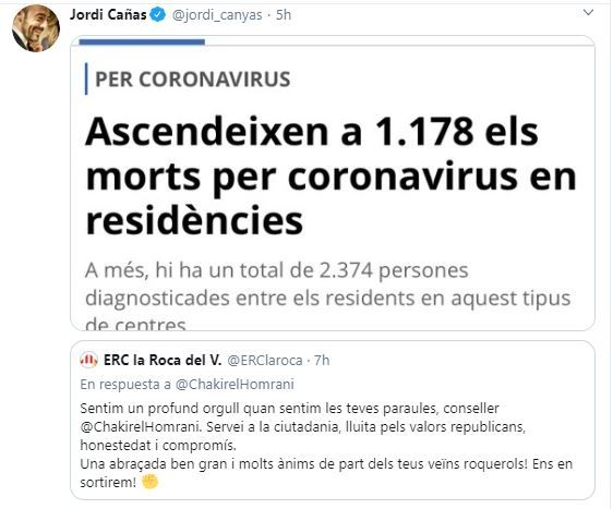 El ‘homenaje’ de ERC de La Roca vino como contestación a un vídeo en redes de El Homrani, con el siguiente texto adjunto: «De esta situación excepcional de crisis sanitaria solo saldremos trabajando conjuntamente. Mi reconocimiento a todos los trabajadores y trabajadores, entidades, empresas y personas voluntarias que se están dejando la piel esta semana».