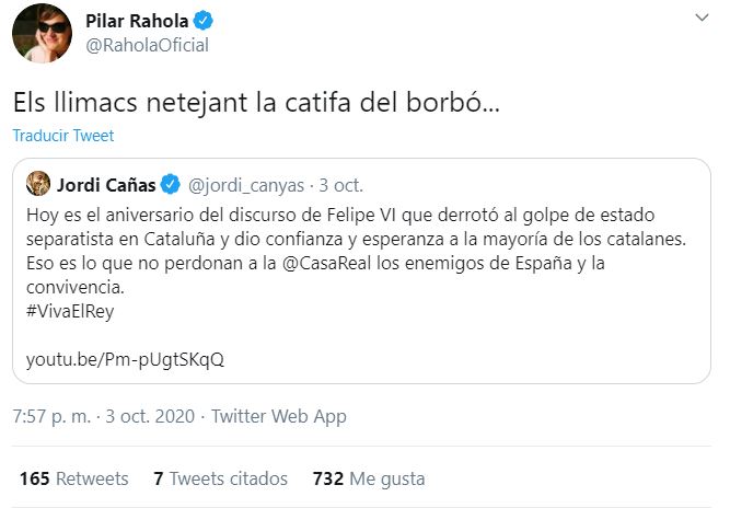«Hoy es el aniversario del discurso de Felipe VI que derrotó al golpe de estado separatista en Cataluña y dio confianza y esperanza a la mayoría de los catalanes. Eso es lo que no perdonan a la @CasaReal los enemigos de España y la convivencia», esto fue lo que dijo Cañas en Twitter.