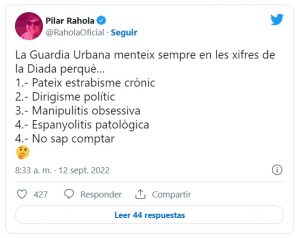 «La Guardia Urbana miente siempre en las cifras de la Diada porque… 1.- Sufre estrabismo crónico. 2.- Dirigismo político. 3.- Manipulitis obsesiva. 4.- Españolitis patológica. 4.- No sabe contar«, ha escrito Rahola.