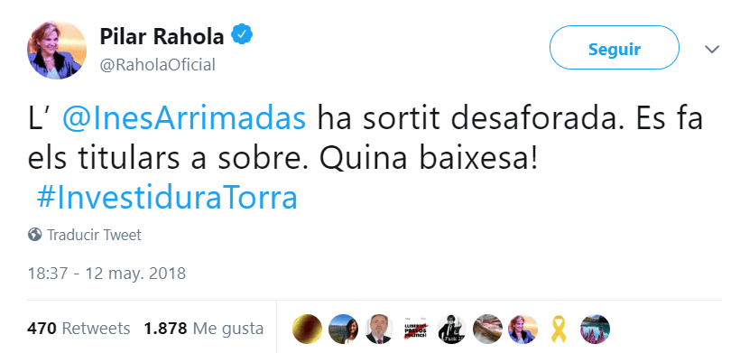 Rahola, que es habitual de varios programas de la televisión autonómica catalana, comentó dicha sesión bajo la etiqueta «investiduraTV3». Esta comentarista que cobra del dinero de todos los catalanes descalificó con grosería las intervenciones de Inés Arrimadas.