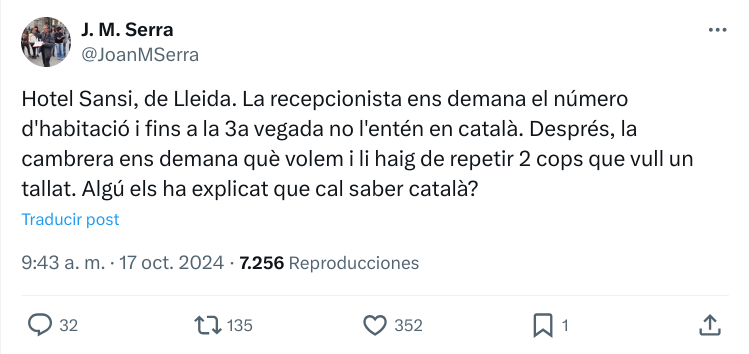 “Hotel Sansi, de Lérida. La recepcionista nos pide el número de habitación y hasta la 3ª vez no se entiende en catalán. Después, la camarera nos pide qué queremos y tengo que repetirle 2 veces que quiero un cortado. ¿Alguien les ha explicado que es necesario saber catalán?”, afirma un usuario de X.