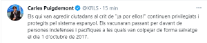 Desde su mansión de Waterloo Carles Puigdemont, una vez que ha conocido esta decisión, ha dado su opinión en las redes sociales donde ha afirmado que «los que agredieron ciudadanos al grito de «¡a por ellos!», continúan privilegiados y protegidos por el sistema español. Los vacunarán pasando por delante de personas indefensas y pacíficas a las cuales golpearon de forma salvaje el día 1 de octubre de 2017«.