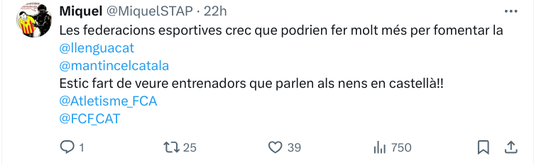 “Las federaciones deportivas creo que podrían hacer mucho más para fomentar la @lenguacat @mantincelcatala Estoy harto de ver a entrenadores que hablan a los niños en castellano!! @Atletismo_FCA @FCF_CAT”, afirma un usuario de X.