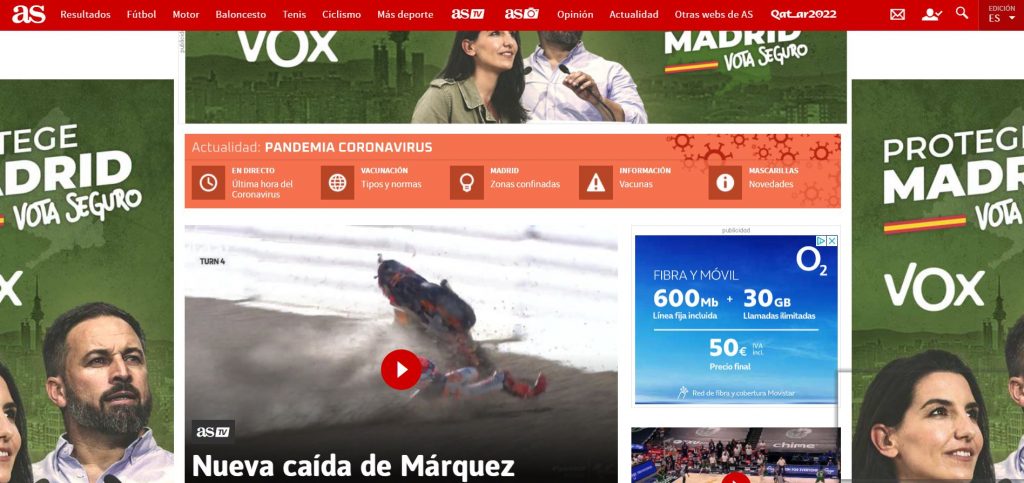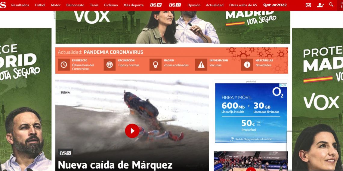 Este mismo grupo, en su diario deportivo de cabecera, AS, ha llenado este domingo su página de entrada de publicidad de la candidatura de Rocío Monasterio a la presidencia del gobierno autonómico madrileño, con el lema «protege Madrid, vota seguro» y con una fotografía de Santiago Abascal con su cabeza de lista».