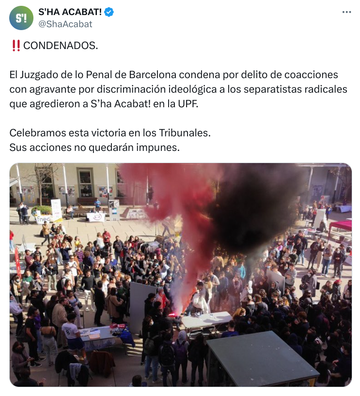 “El Juzgado de lo Penal de Barcelona condena por delito de coacciones con agravante por discriminación ideológica a los separatistas radicales que agredieron a S’ha Acabat! en la UPF. Celebramos esta victoria en los Tribunales. Sus acciones no quedarán impunes”, escribían en sus redes sociales los jóvenes de S’HA ACABAT!, hoy es un día para celebrar, sin lugar a dudas.