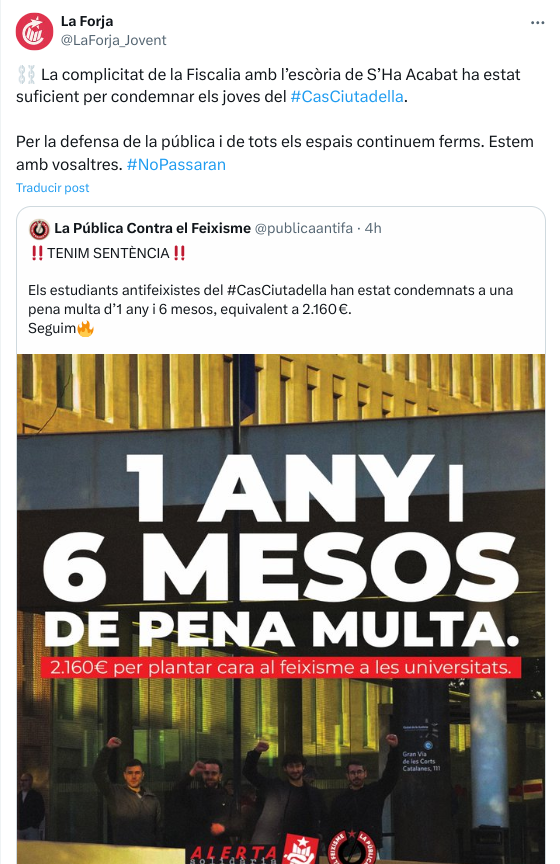 La condena impuesta a los radicales asciende a un año y seis meses de prisión, equivalente al pago de 2.600 euros de multa. Lo curioso del asunto, es que los agresores se autodenominan “antifascistas” en sus redes sociales y tachan de “escoria” a S’HA ACABAT!. Esto deben ser cosas de la “pacificación” y la “normalización” que han traído a Cataluña, Pedro Sánchez y Salvador Illa.