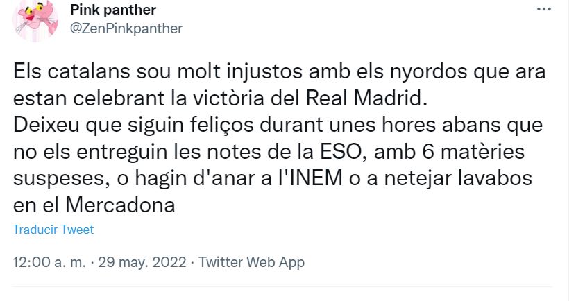 El separatismo catalán, más light o más radical, está rabiando sin parar desde que el Real Madrid consiguió en la noche del sábado su 14ª Copa de Europa tras vencer al Liverpool por uno a cero (gol de Vinicius), y tras un gran partido de su guardameta, Courtois.