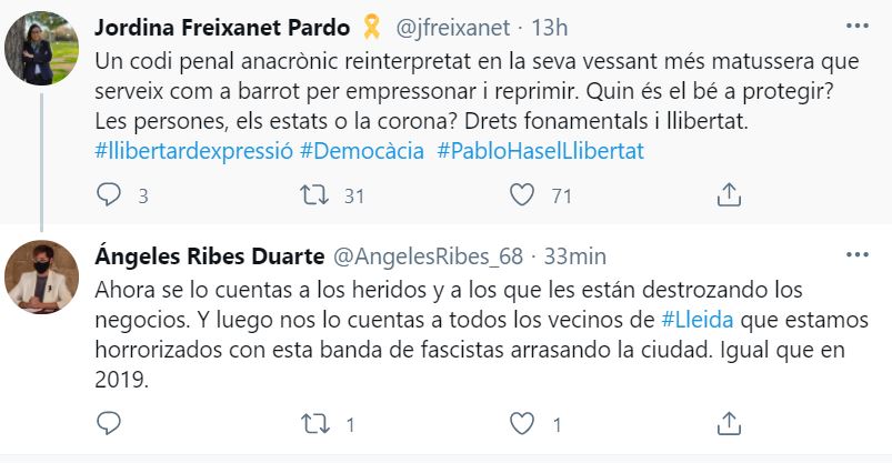 La jefa de filas de Cs en Lleida, Ángeles Ribes, ha echado en cara a la teniente de alcalde de este ayuntamiento, la separatista Jordina Freixanet, su apoyo a Pablo Hasél mientras violentos están destrozando los comercios de la ciudad.